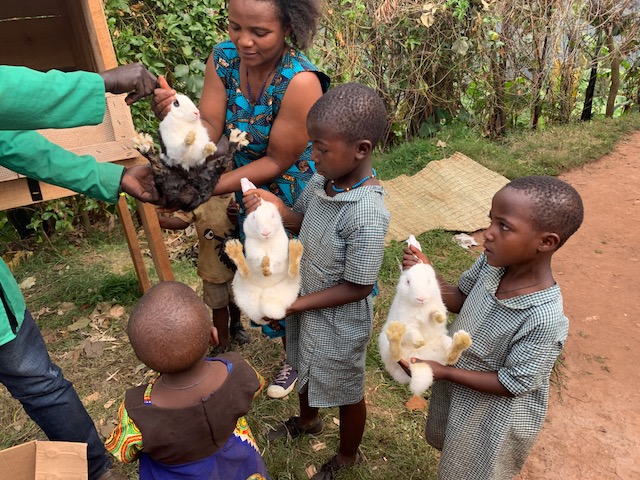 Esther reached out to the KIHEFO organization and was given a job working in the Garden of Prosperity, a shop where single or struggling women make clothing and souvenirs and sell them, receiving a large portion of the sales to keep for themselves. Almost every day Esther wakes up at 5 in the morning and makes the three hour trip on foot to Kabale. She works all day in the shop, and then walks 3 hours back through the town and up the mountain to her home. Through this enormous sacrifice, she is able to provide basic nourishment for her children, and schooling for two of them. The rest cannot afford to go to school, and spend their days working in their garden and hiking up and down the mountain to fetch water from the stream. Despite her efforts, each of her children struggled with malnourishment. The KIHEFO Nutrition Center helped nourish her kids back to health and provide her with the knowledge and tools needed to keep them fed and healthy. Though she sacrifices more than any woman should ever have to for her children, her efforts still did not provide her with everything she needed to raise a happy, healthy, and educated family. But now, thanks to the power of 3 rabbits, she will.